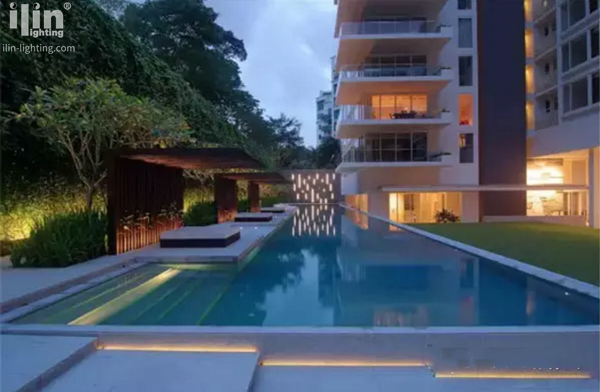 室外泳池的灯光设计中,利用水的反射特性,运用了大量的焦点灯光,嵌壁灯、水平射灯、植物射灯,形成多焦点的氛围效果。