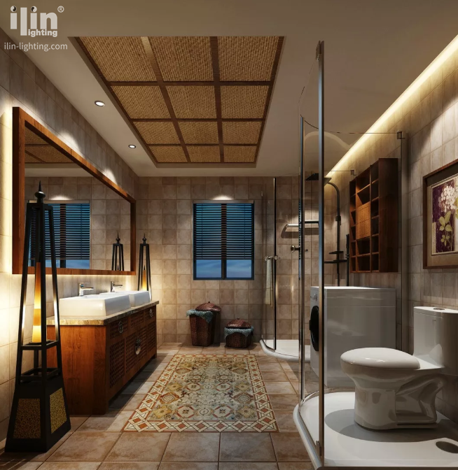 浴室照明主要由沐浴区与梳洗区组成,沐浴区域包括沐浴空间和浴盆、坐厕等空间,以柔和的光线为主,梳洗区域由于有梳洗、化妆、剃须和穿衣等功能需求镜前周边照度应该充足,且均匀分布在脸部、头发和颈部,并避免阴影的产生,如果由安装在天花板中心的灯具提供照明,人照镜子时就容易造成面部阴影,该灯具只适合用于一般照明,而不能用做化妆时的照明。