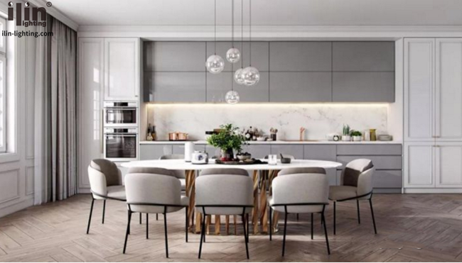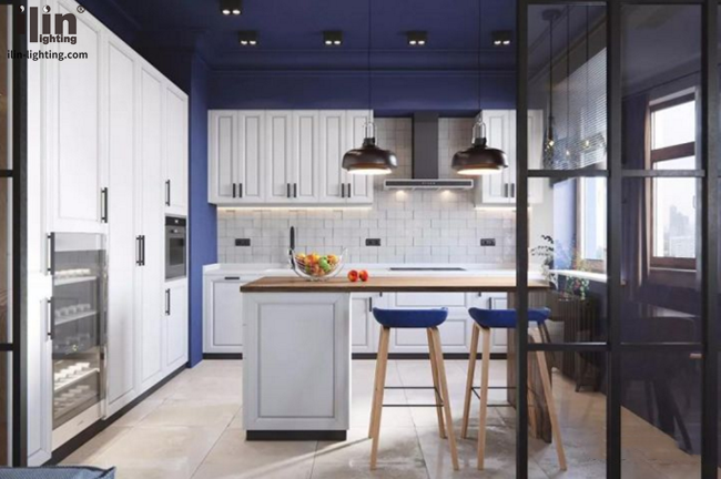 厨房照明区别于其他空间,更加强调功能性,装饰性的灯具可以少用,甚至不用。由于主灯一般位于吊顶正中间,而人在烹饪、洗菜时都是背对主灯的,这时身体和吊柜的影子都落在台面上,工作区域反而很昏暗,因此厨房最好以筒灯、射灯、灯带等焦点光照明。最好在橱柜下面加设宜琳橱柜灯作为底灯,烹饪时台面可以更加光亮。