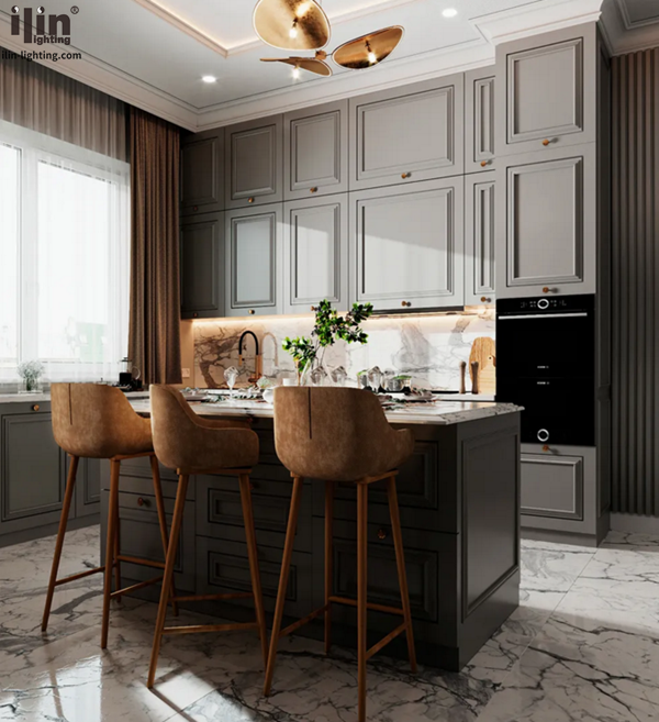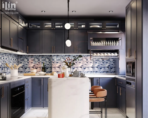 柜体墨绿与深灰的组合呈现出摩登都市品味,又不缺乏自在与情调感,现代轻奢的时尚干练与光洁质感,融入美式的典雅柔美与温馨,这些元素也正迎合了时下的消费者对小资生活方式的需求。橱柜搭配的是宜琳暖光橱柜灯和酒柜灯,与橱柜颜色搭配,显得有文化感、有贵气感。