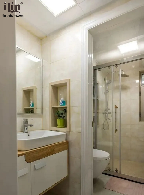 卫生间洗手台外移,做了干湿分离设计,“早高峰”互不打扰,洗漱区利用墙壁做了壁垄设计,来收纳洗漱用品,释放洗漱台上的空间。