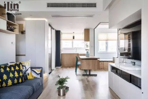 客厅和阳台打通空间更宽敞,无主灯设计整体自由度高,可控范围大。电视墙直接定制储物柜,避免空间浪费还增加储物空间。