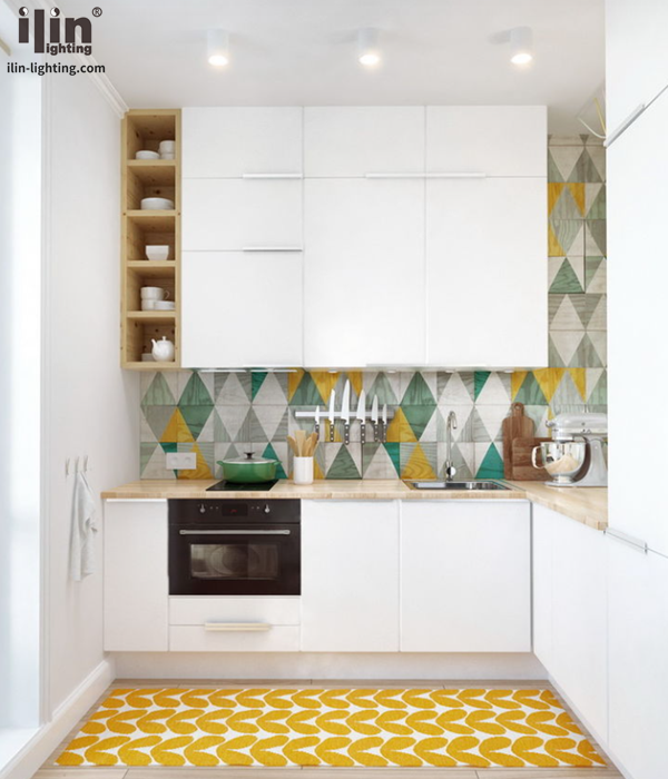 厨房背景瓷砖的三角形图案是一大亮点,让整个厨房空间多了一点生活和艺术的气息,吊柜底部贴心地安装了几个橱柜灯,这样台面不管什么时候都能看得清。
