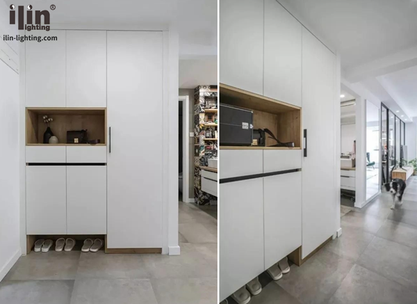 进门直对嵌入式鞋柜,一般上下镂空满足基本的收纳,另一半通柜布局,满足进门随手挂衣需求,保证空间的时刻整洁,白色平板与木色的套色干净清新。鞋柜墙面与干区门洞以及次卧电视墙平齐,利用局部墙面安装了一个全身镜,既满足了功能,又能让视觉更有通透感,灰色的水泥砖通铺,耐脏防滑而且有质感。