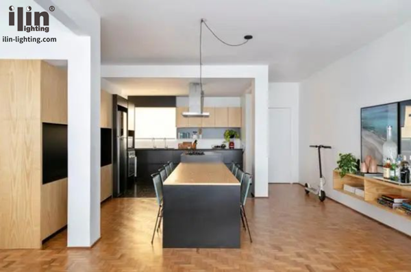 功能区打通后,其实还有这样一个优势,少了隔断,收纳不间断更有连续性,比如餐厅靠墙做餐边柜,现在连着厨房橱柜,使用上也要方便了不少。