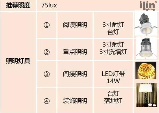 照度上,客房照明的平均照度达到75lx即可。客房所用灯具类型,按照使用目的来分大致有四类:阅读照明、重点照明、间接照明和装饰照明,对应的灯具选型如下图所示。
