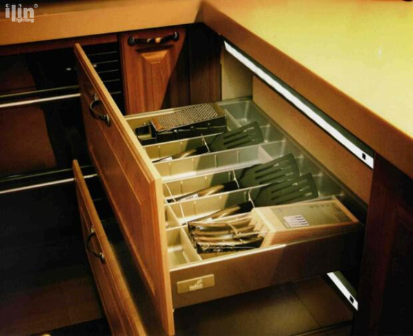 对橱柜内部的照明一般是在橱柜较深需要光线的位置,如吊柜底部、转角柜处、米面粮油等储存区,可以采用感应式橱柜灯,打开时自动点亮,关闭柜门时自动熄灭。