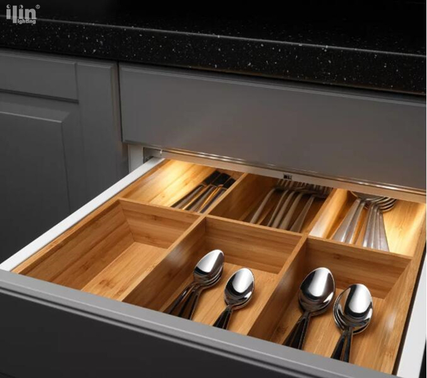 在抽屉里装一个ilin抽屉灯,即使深夜来到厨房,无需打开任何主灯,只要拉开抽屉,就能找到你想要的用具了。